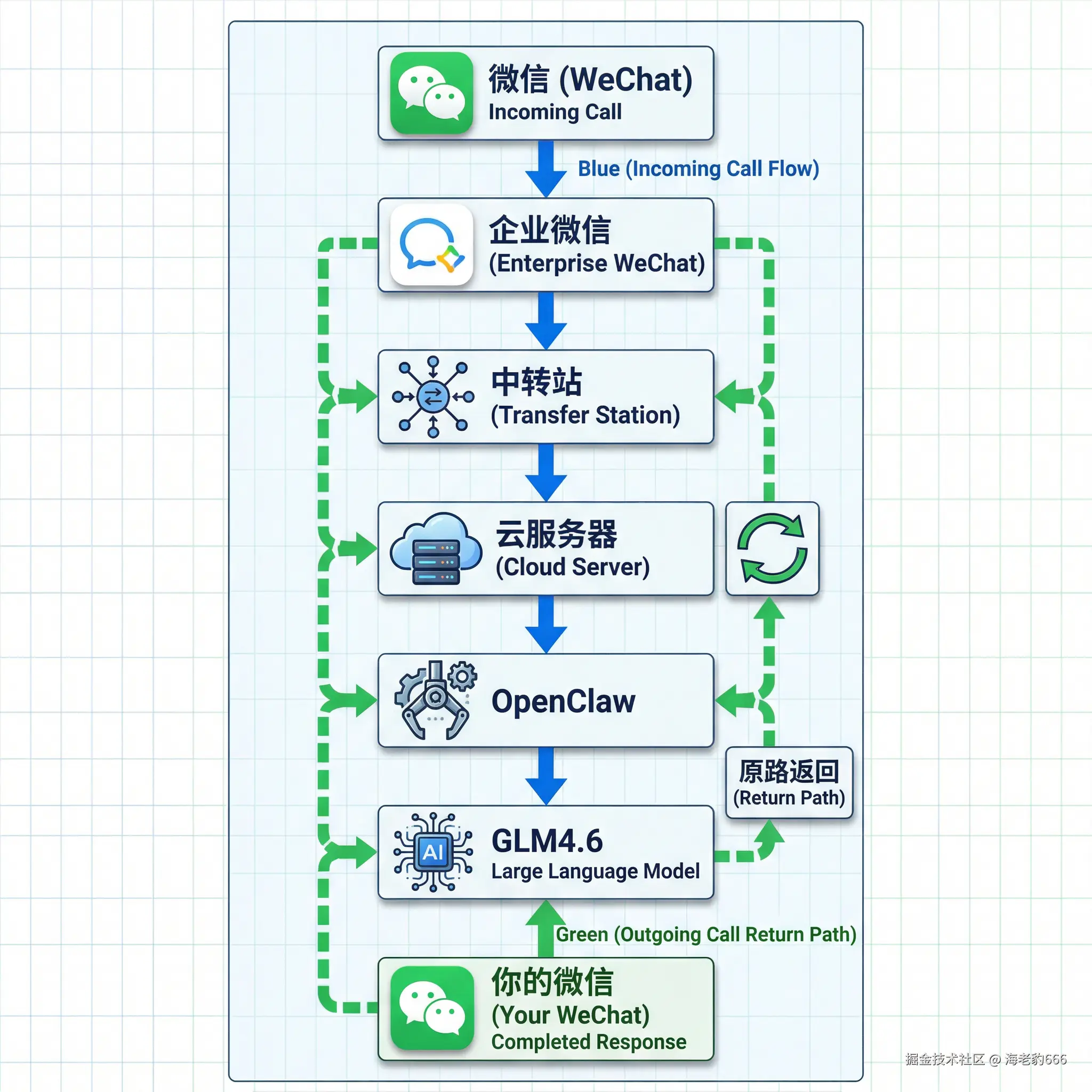 你的微信 → 企业微信(中转站)→ 云服务器上的OpenClaw → 调用glm4.6 → 原路返回 → 你的微信