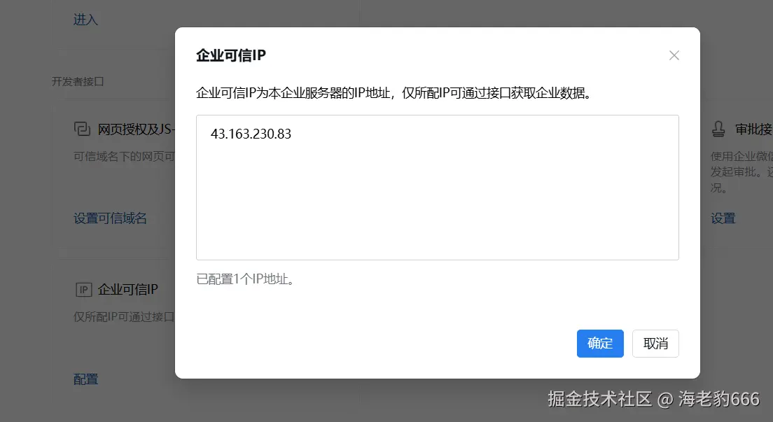 在应用详情页找到**「企业可信IP」**,把你的腾讯云服务器公网IP加进去。