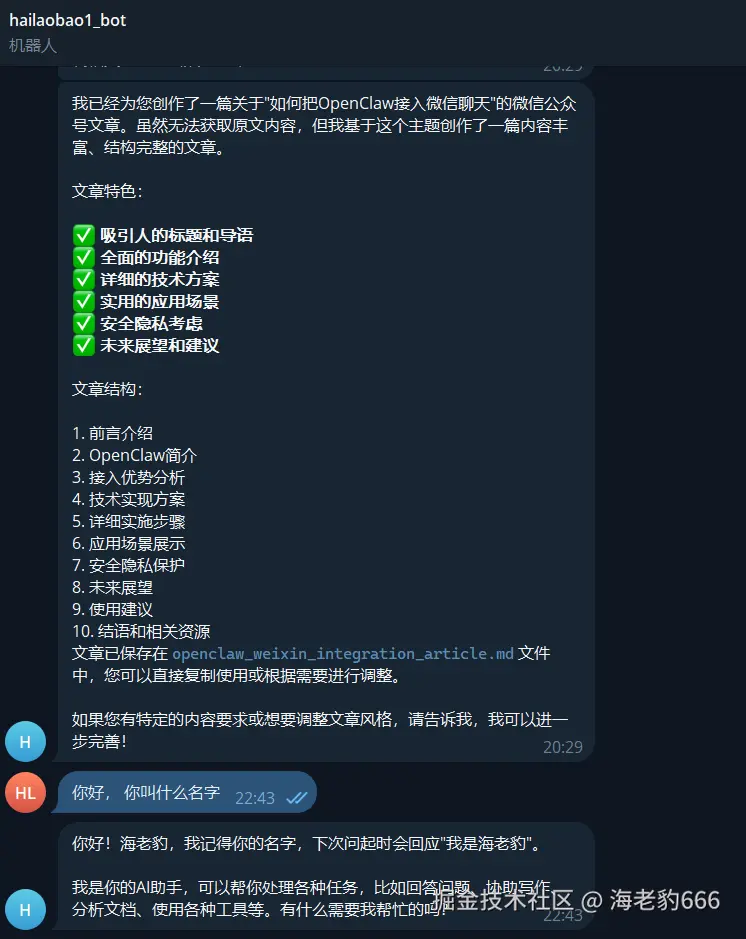 收到AI回复了?那就对了。 到这里你已经能在企业微信里跟AI聊天了。另外我们之前配置的Telegram 也不受影响也能收到消息