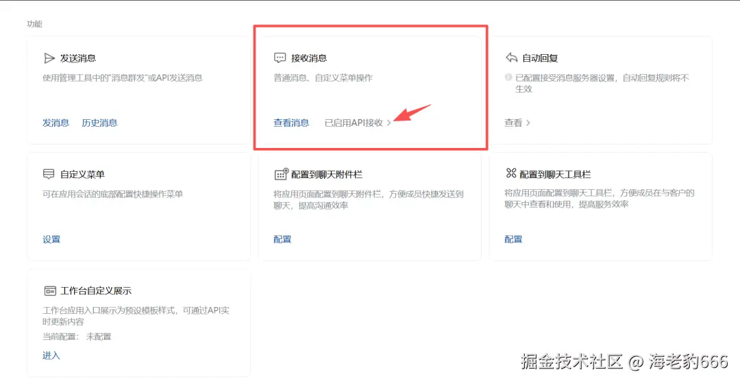这一步是让企业微信知道"收到消息后往哪里转发"。在应用详情页找到**「接收消息」→「设置API接收」**: