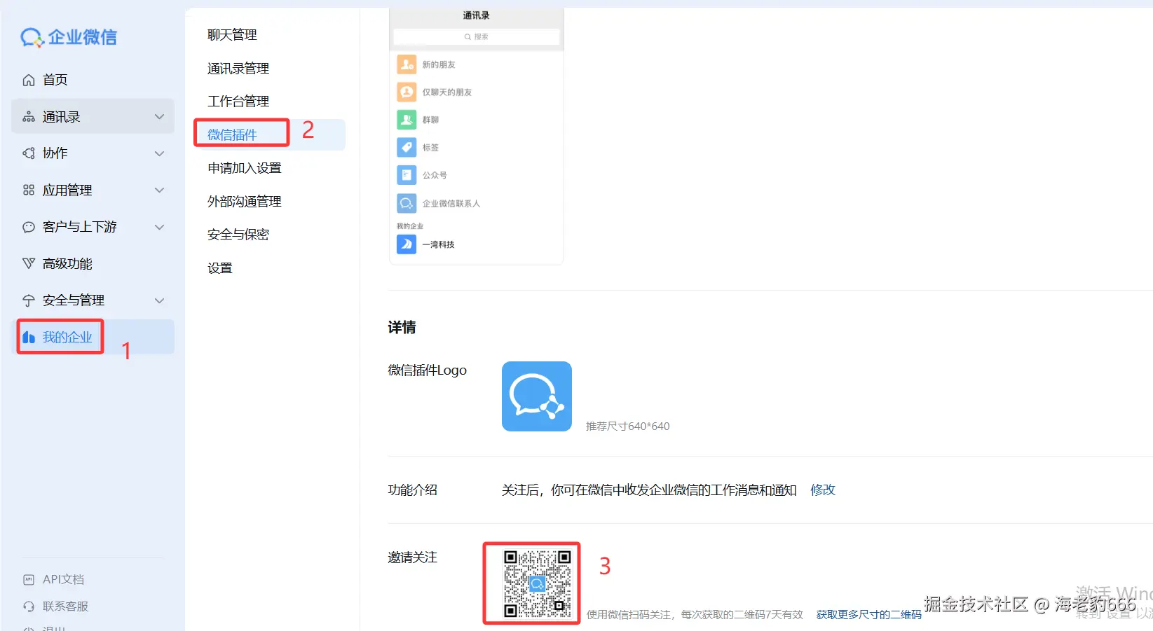 企业微信管理后台 → 「我的企业」 → 「微信插件」 → 启用。