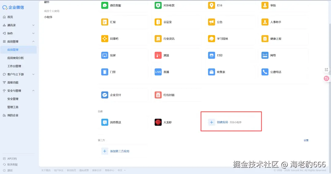 接下来我们在企业微信里创建一个自建应用,这个应用就是你的AI助手在企业微信里的"身份"。