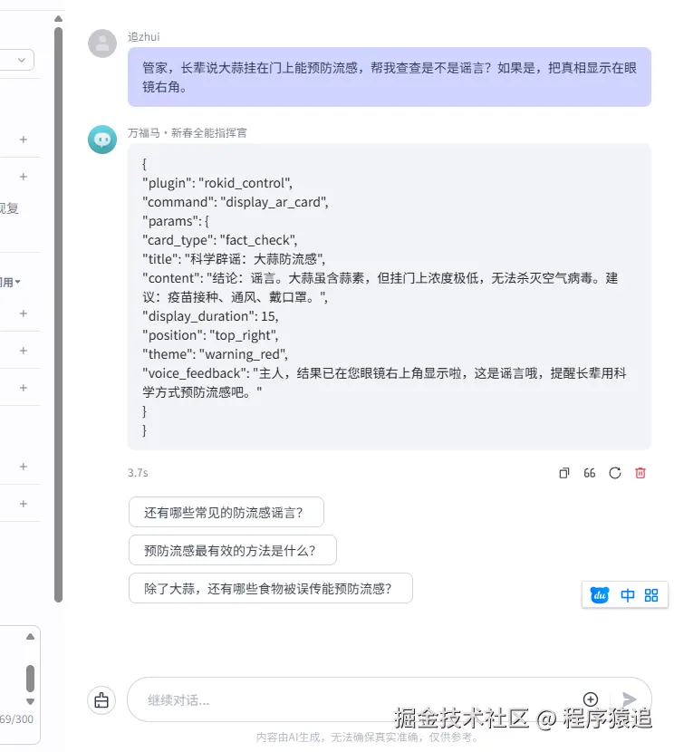 谣言鉴别插件,并结合必应搜索获取最新的医学解释。 - 结果转换:将干巴巴的搜索结果转化为适合 AR 眼镜展示的"科普微卡片"。