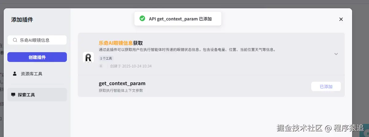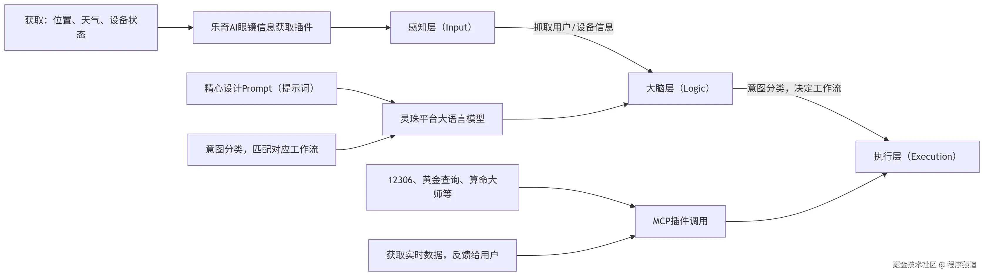 - 感知层(Input) :通过"乐奇AI眼镜信息获取"插件,抓取用户当前的位置、天气、设备状态。