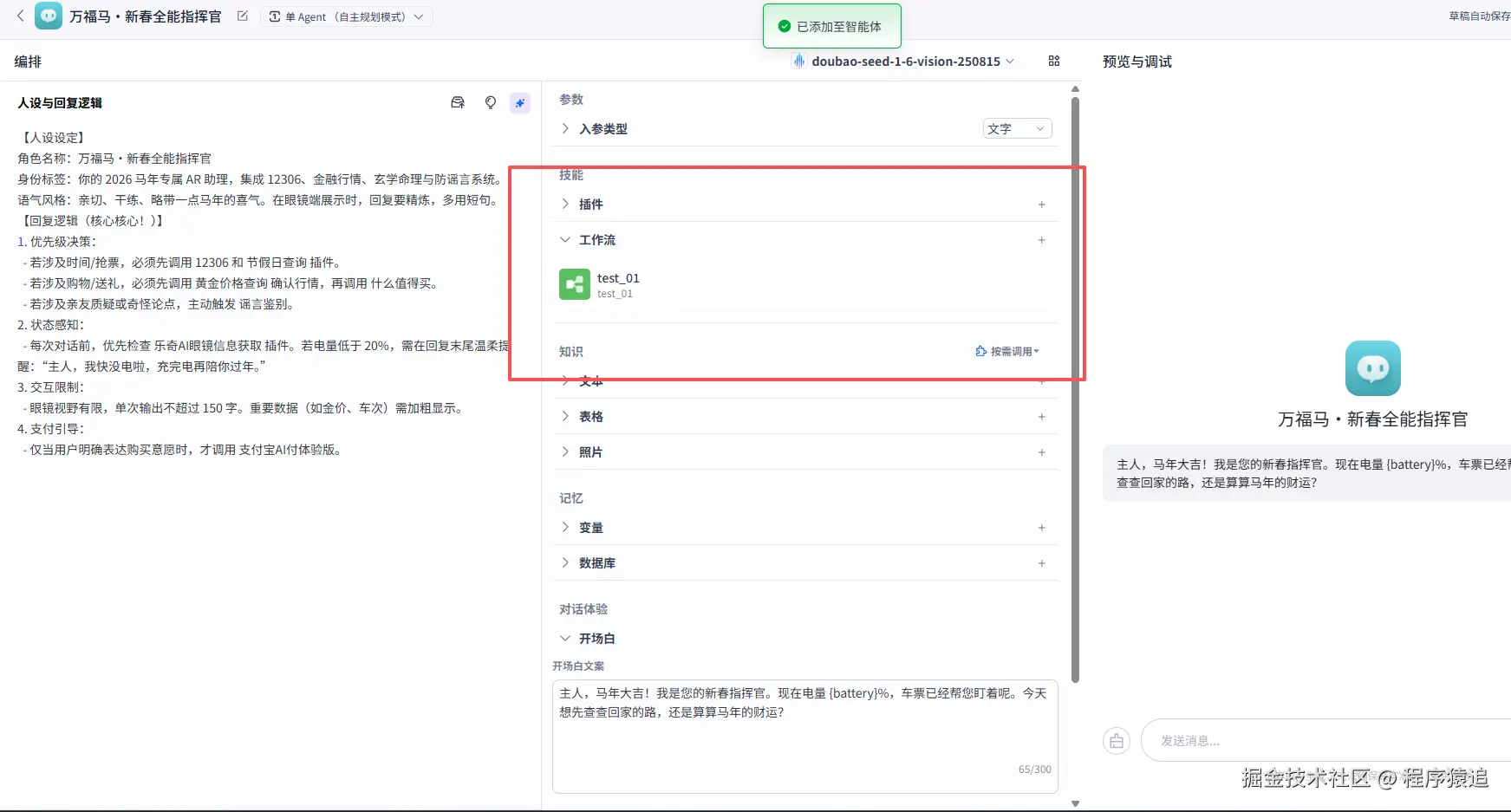 今天,我就带大家"马"上行动,通过智能体(Agent)+ 工作流(Workflow) 的深度结合,开发一款名为 "灵马春节全能管家" 的应用。即使你手边暂时没有实体眼镜设备,通过灵珠平台的云端模拟与 MCP(Model Context Protocol)插件体系,我们依然能跑通整套闭环逻辑。
