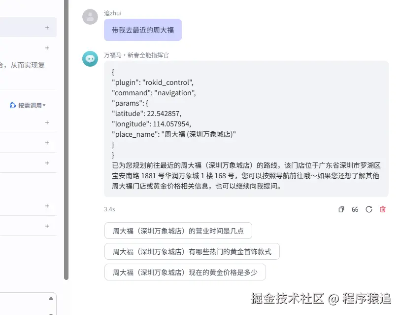 在灵珠的"预览"窗口,我们可以模拟眼镜端的输出。当智能体调用 乐奇AI眼镜控制插件 时,虽然我们手里没有眼镜,但可以在后台看到下发的 JSON 指令。