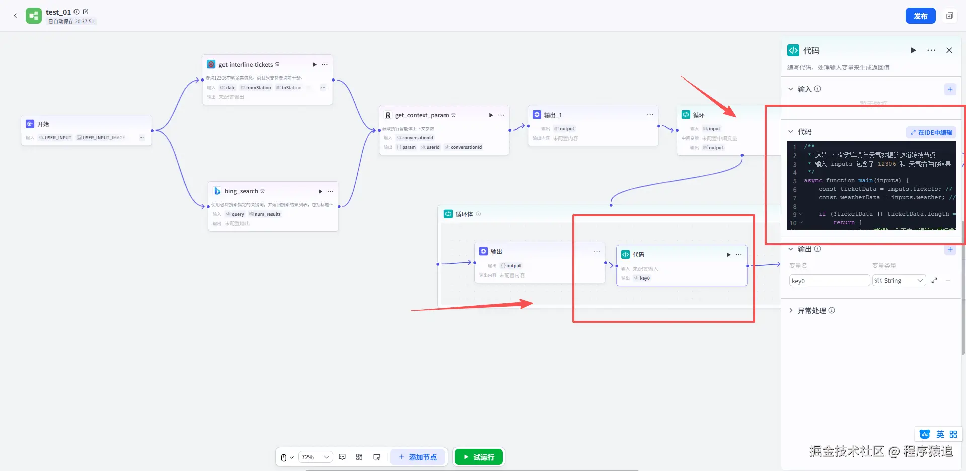 在灵珠平台中,MCP 插件的调用是自动化的,但数据的前后置处理 需要开发者介入。同样的操作,在我们循环体里面添加下面的代码,添加查询金价、谣言鉴别的插件工作流节点。