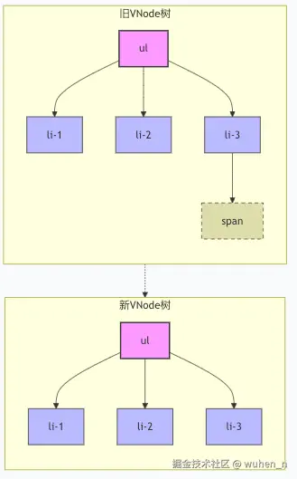 这种操作会让算法变得极其复杂,而且实际开发中,跨层级移动节点的情况非常罕见。所以 Vue 选择简化问题:如果节点跨层级了,就视为不同类型,直接替换。