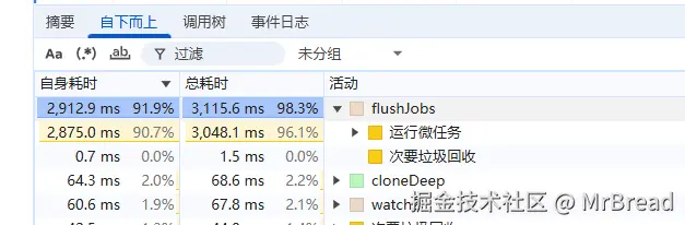 我老老实实的打开performance,查看一下这地方的点击前后的性能分析,发现点击按钮后执行的时间来到了3秒,其中大部分时间都在执行微任务。
