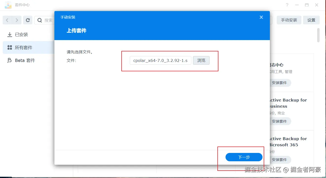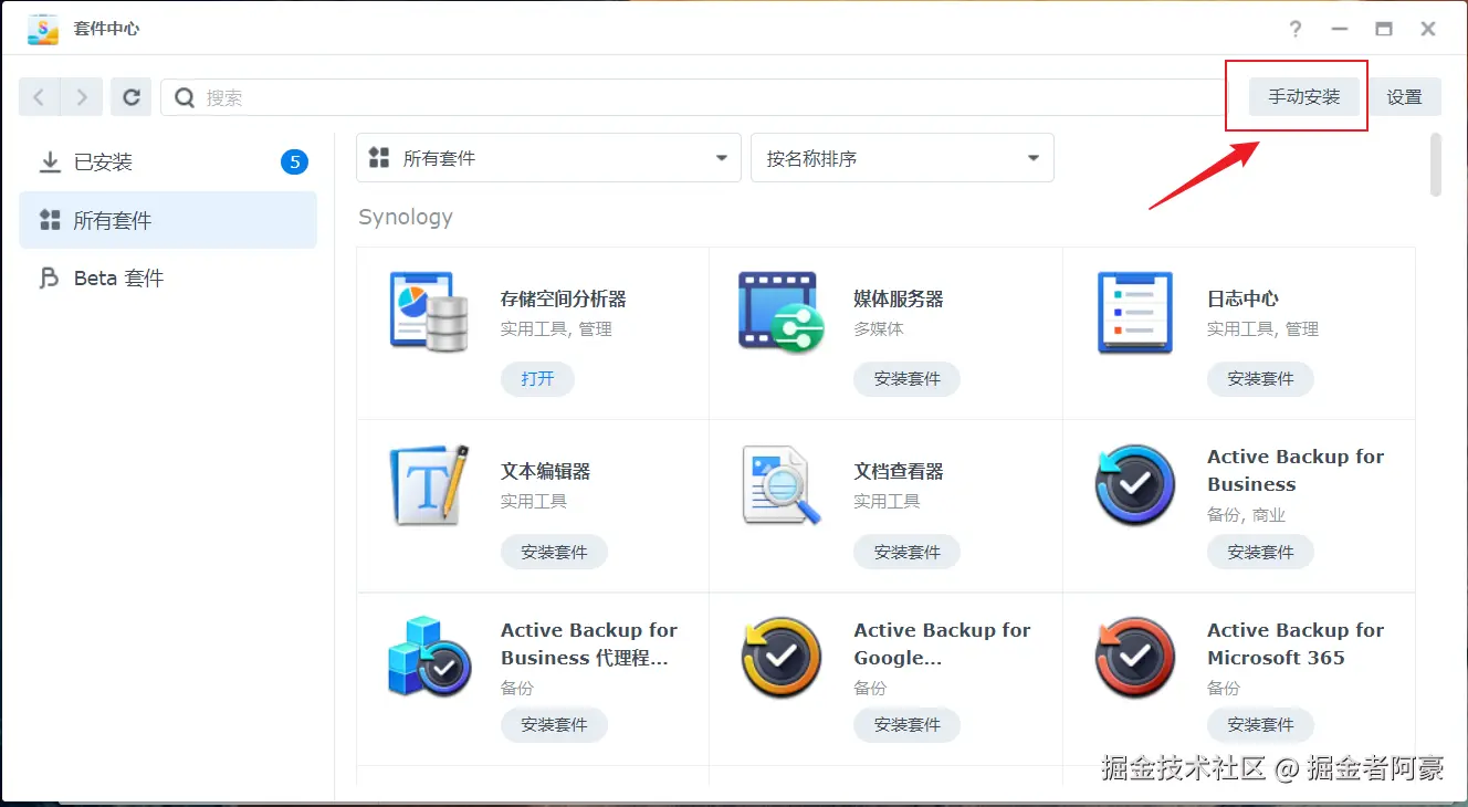 打开群晖套件中心,点击右上角的手动安装按钮。