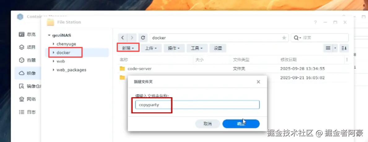 然后我们去文件管理中,在docker文件夹中创建一个新文件夹copyparty