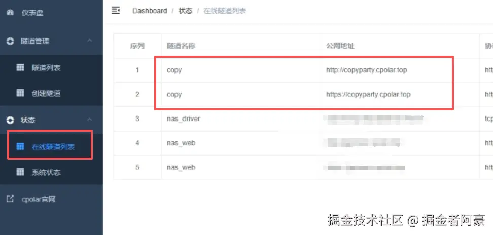 创建成功后,打开左侧在线隧道列表,可以看到刚刚通过创建隧道 生成了两条固定的二级子域名公网地址。