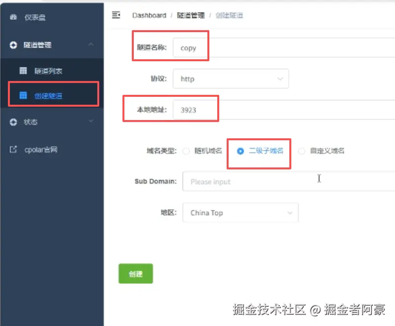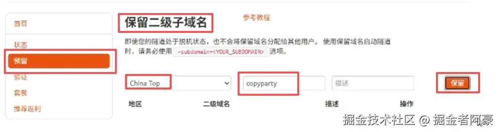 - 端口类型:因为我想长期使用所以我选择二级子域名,如果你只是为了测试或者非长期使用也可以选择随机域名,这个是免费的,但是24小时后域名会变化,需要再次复制,大家按照自己需求来选择就行!