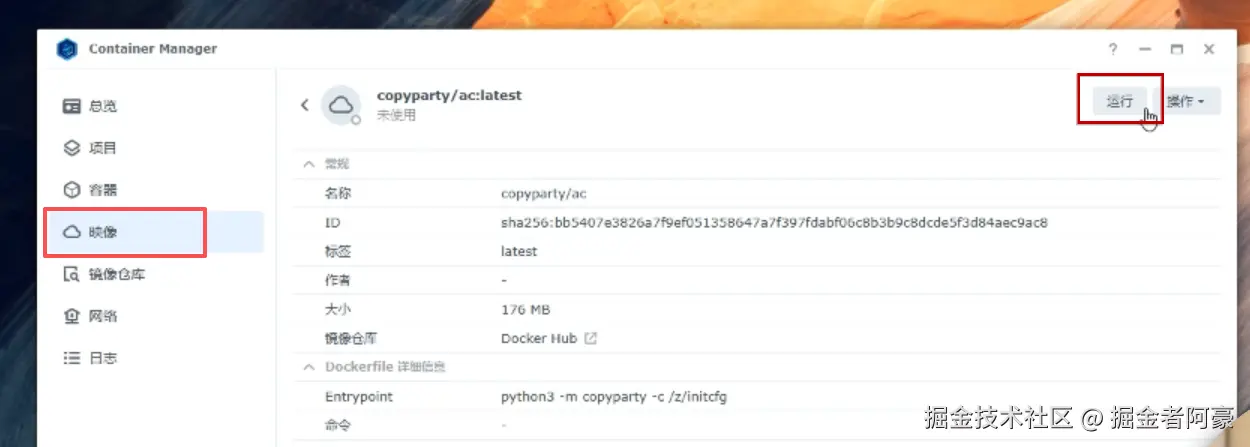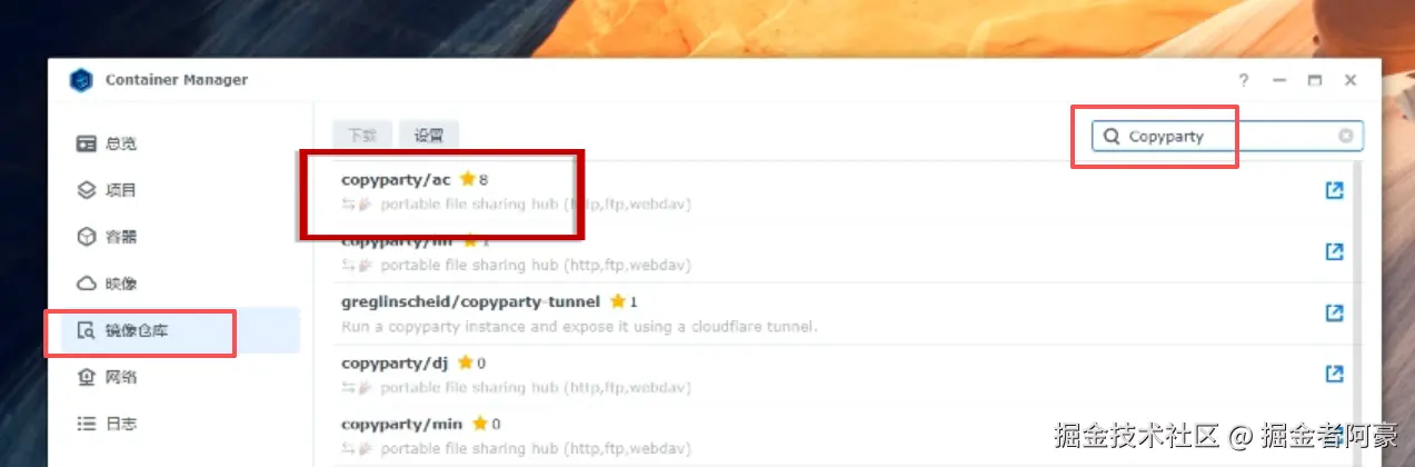 点击镜像仓库,在搜索栏搜索Copyparty,跳出来的第一个ac这个就是,双击它后点击下载。