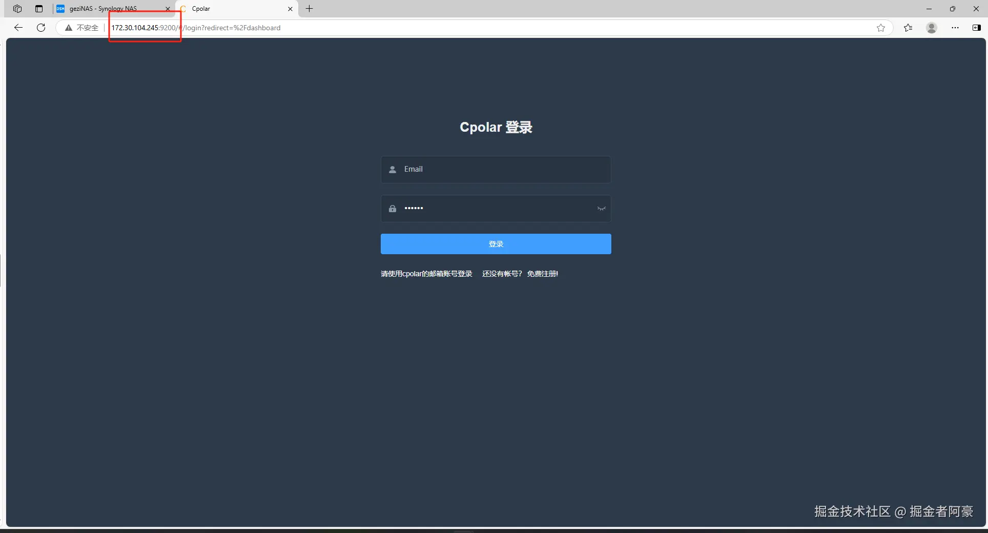 安装完成后,在外部浏览器,我们通过群晖的局域网ip地址加9200端口访问Cpolar的Web管理界面,然后输入Cpolar邮箱账号与密码进行登录,登录后,一切的操作在管理界面完成.