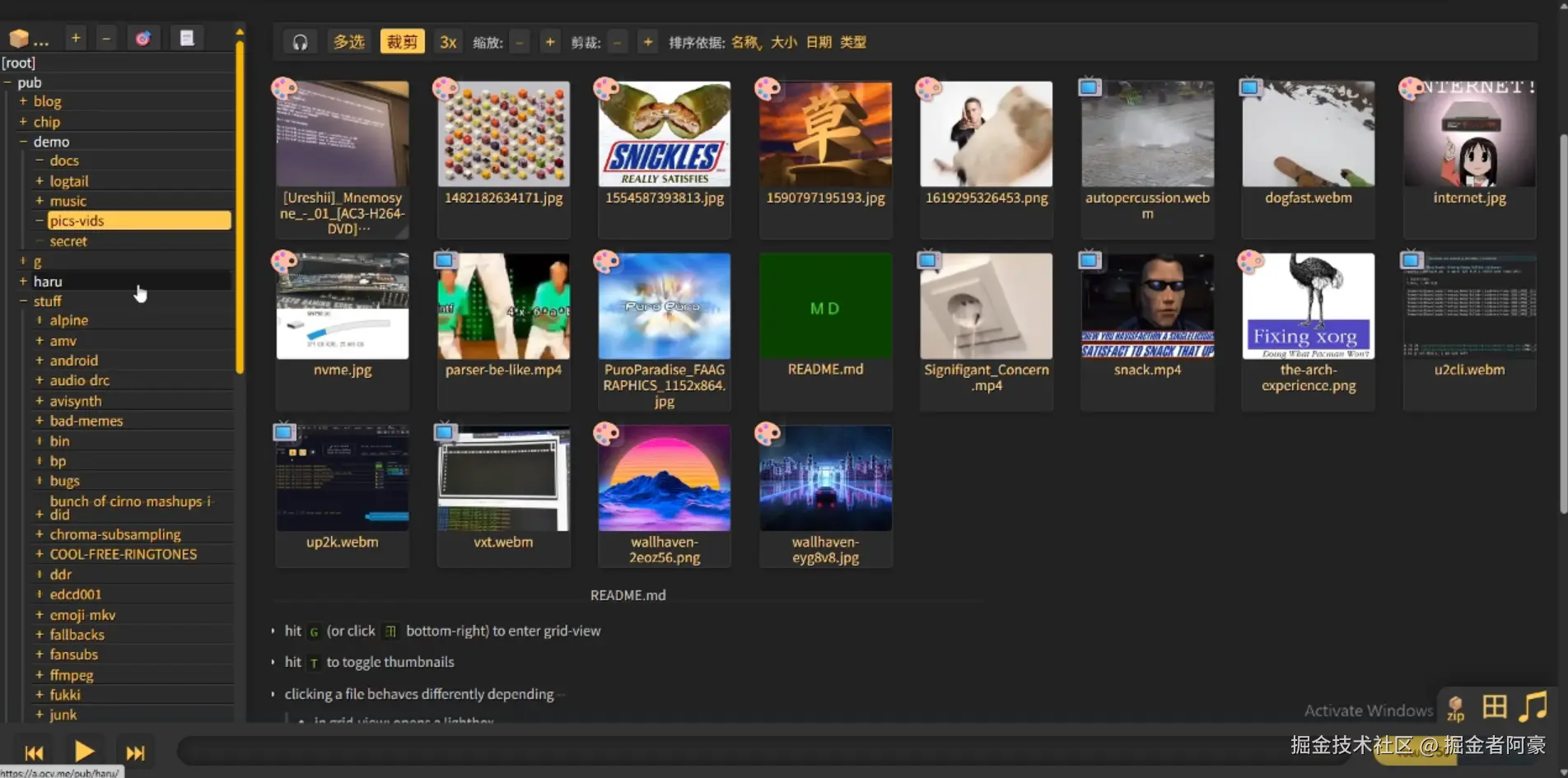 回到copyparty刷新页面,音视频、pdf 、图片都可以直接播放或者阅读,而且都是有封面的,也支持自定义缩略图的大小和格式。
