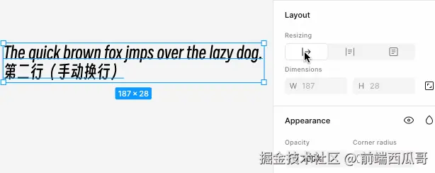 Figma 的文字对象,同时自适应宽度、固定宽度两种效果。