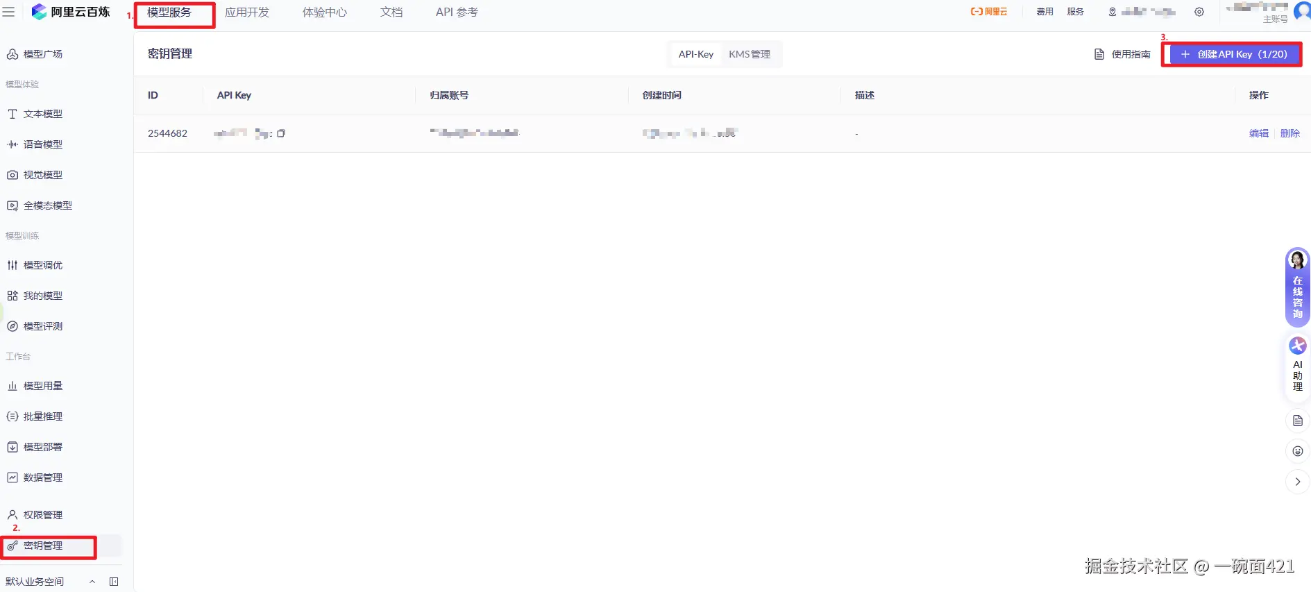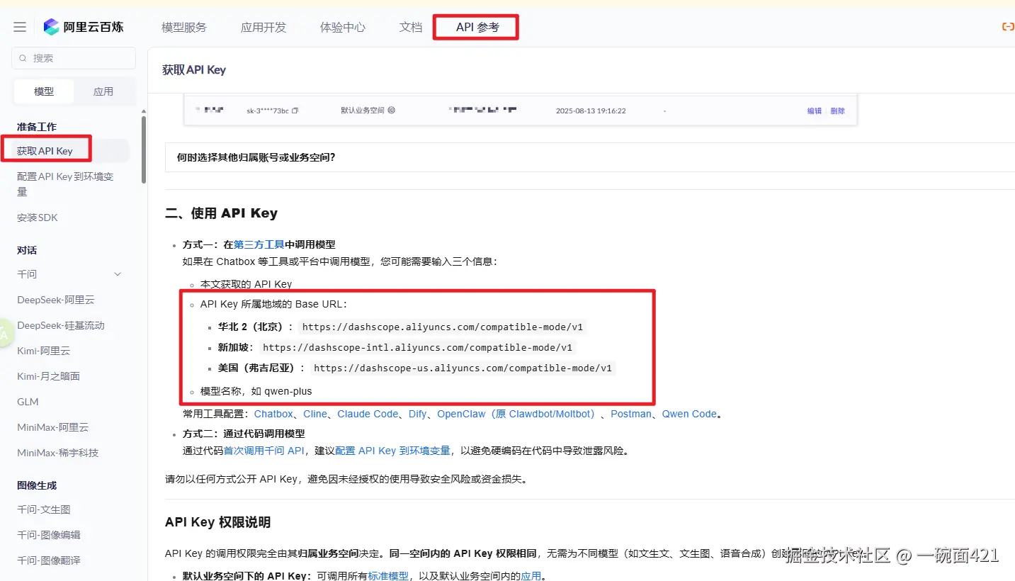 下方以DeepSeek和阿里云百炼平台为例获取大模型调用的三个参数,其他平台的模型类似。