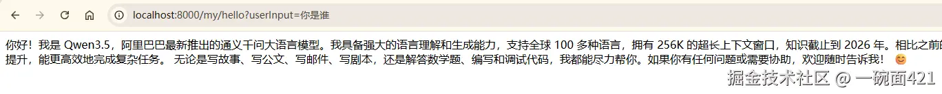 以上就是本篇博客的全部内容。 至此,我们的第一个 Spring AI 应用已经成功跑起来了,我们下次再见。