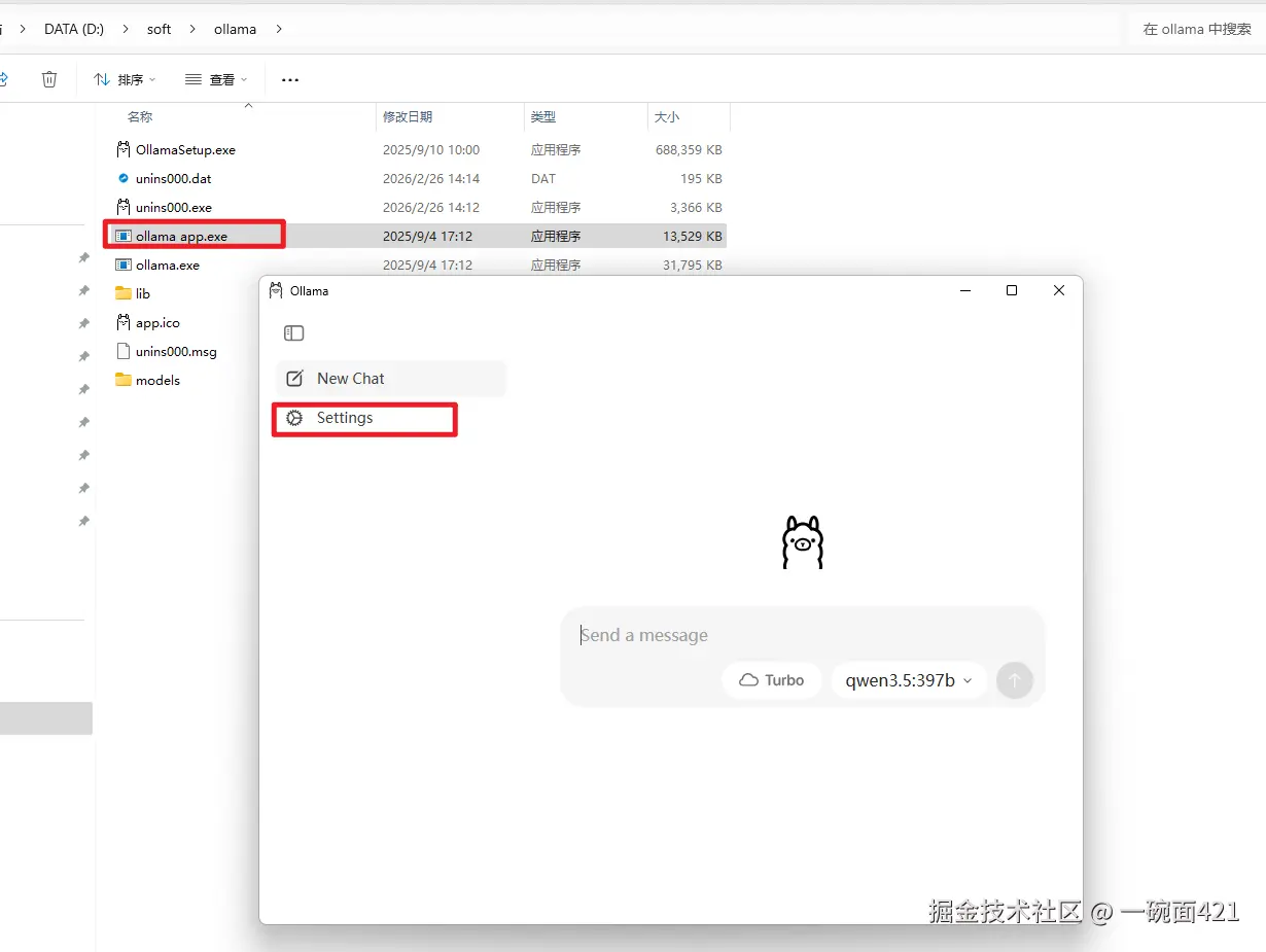 启动ollama app.exe,打开设置