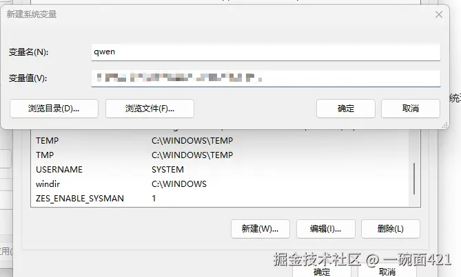 ApiKey推荐配置成系统环境变量,然后在项目中获取,这里我们将阿里云百炼平台中的ApiKey配置在系统环境变量中。变量名字可以自定义。