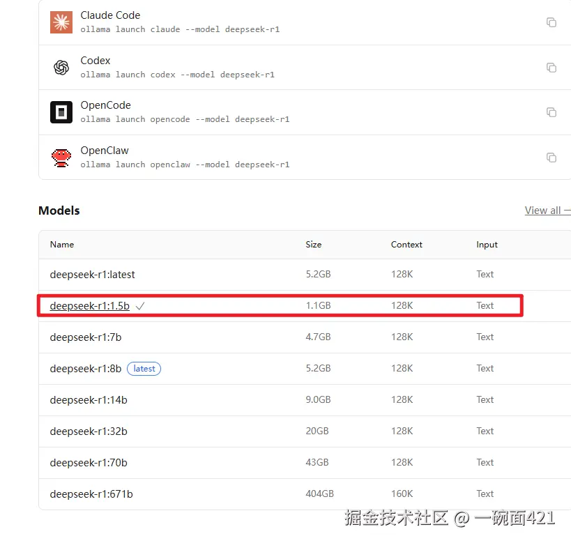 - 打开Ollama官网 ollama.com/search 搜索自己想要安装的模型,这里为了演示安装一个比较小的模型deepseek-r1:1.5b