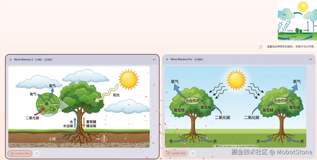我从 Google 的博客文章中拿了水循环的图片,让 Nano Banana 们重新生成一个光合作用的图表。