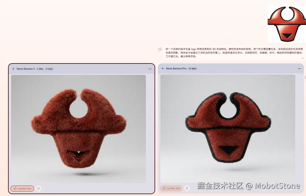 提示词:把一个简单的扁平矢量 logo 转换成柔软的 3D 毛绒物体。使用完全相同的颜色。整个形状覆盖着毛发,具有超逼真的毛发质感和柔和阴影。物体居中放置在干净的浅灰色背景上,轻盈地漂浮在空中。风格超现实、有触感、现代,唤起舒适和趣味的感觉。工作室灯光,高分辨率渲染。