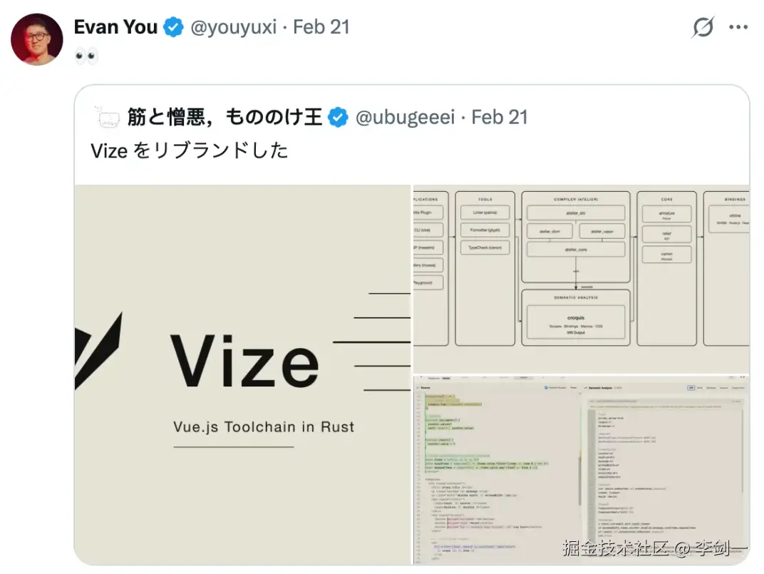 而 Vize 用 Rust 重构了这些核心能力,核心目标是:高性能 + 统一的 Vue 语法解析 / 处理内核,让 Vue 项目的编译、检查、格式化等流程更快、更统一。