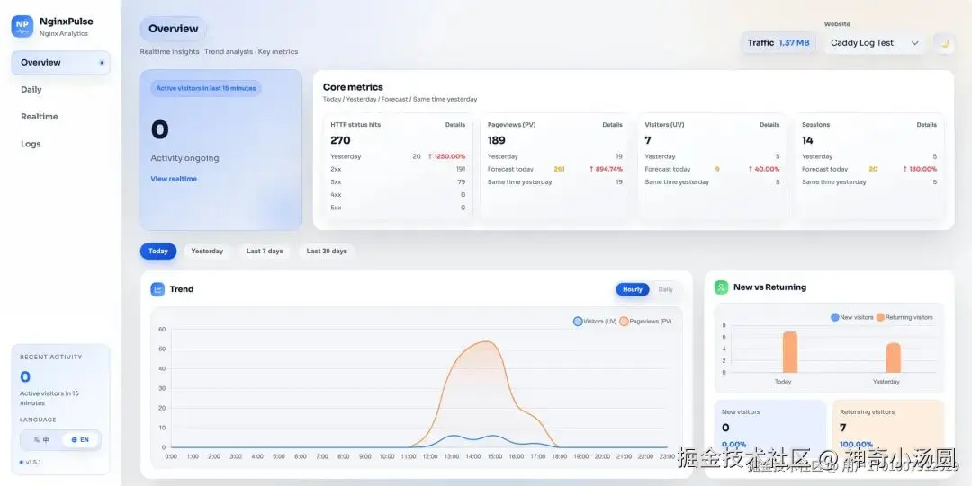 之前试过 GoAccess、ELK 那一套,要么配置麻烦,要么太重量级。最近发现了一个叫 NginxPulse** 的项目,用下来感觉还不错,分享给大家。