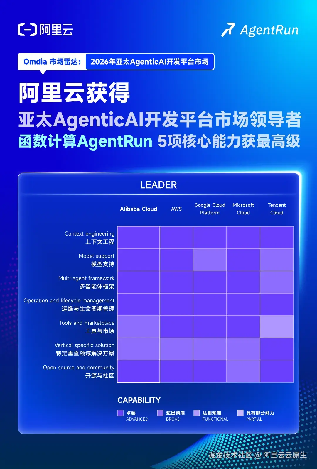 - Omdia 发布《2026年亚太Agentic AI开发平台市场评估报告》,阿里云凭借函数计算 AgentRun卓越的技术深度和全栈AI布局摘得"领导者"桂冠,5项核心能力获得最高评级(Advanced)