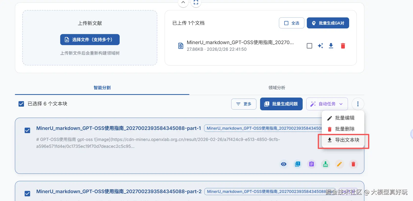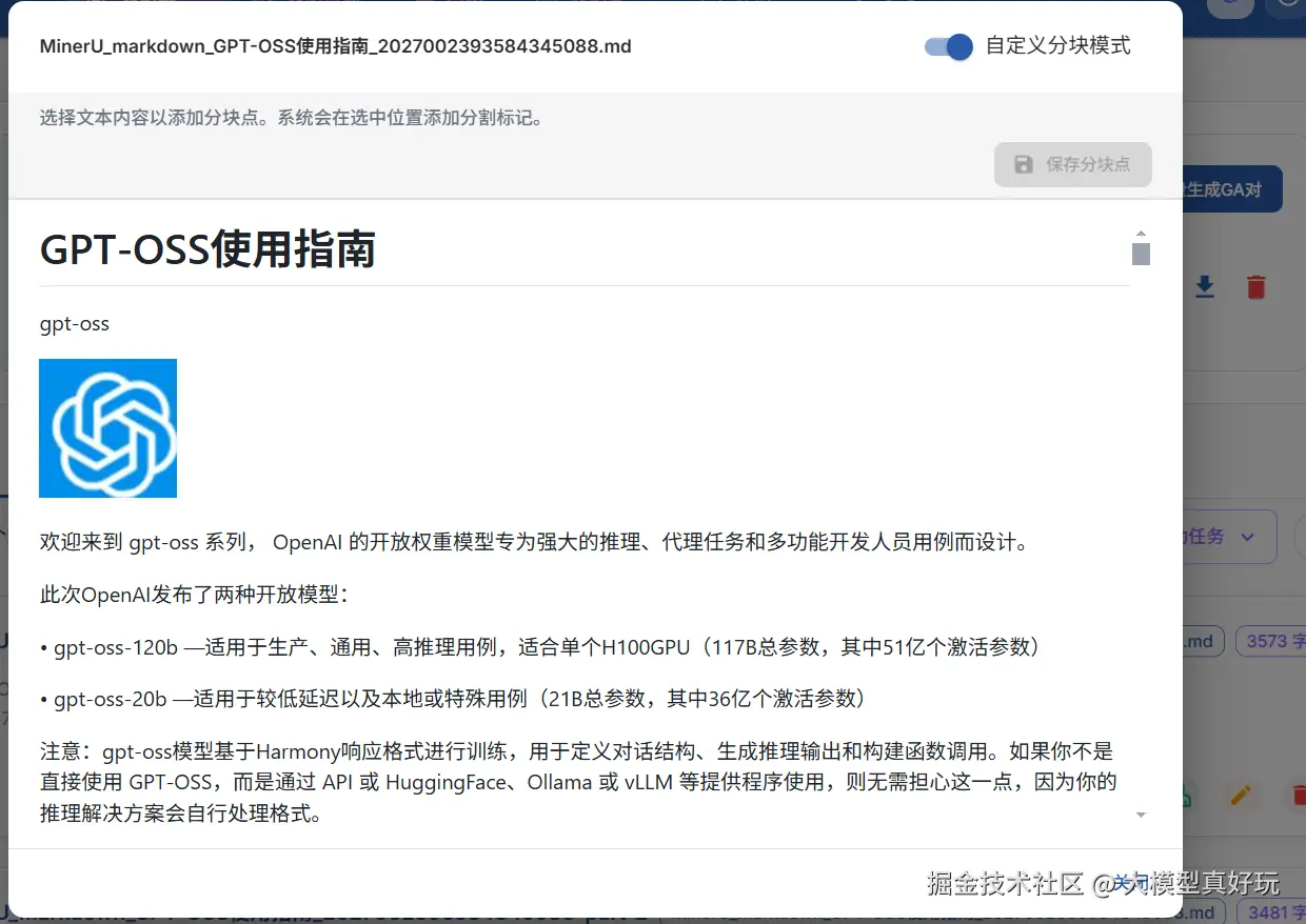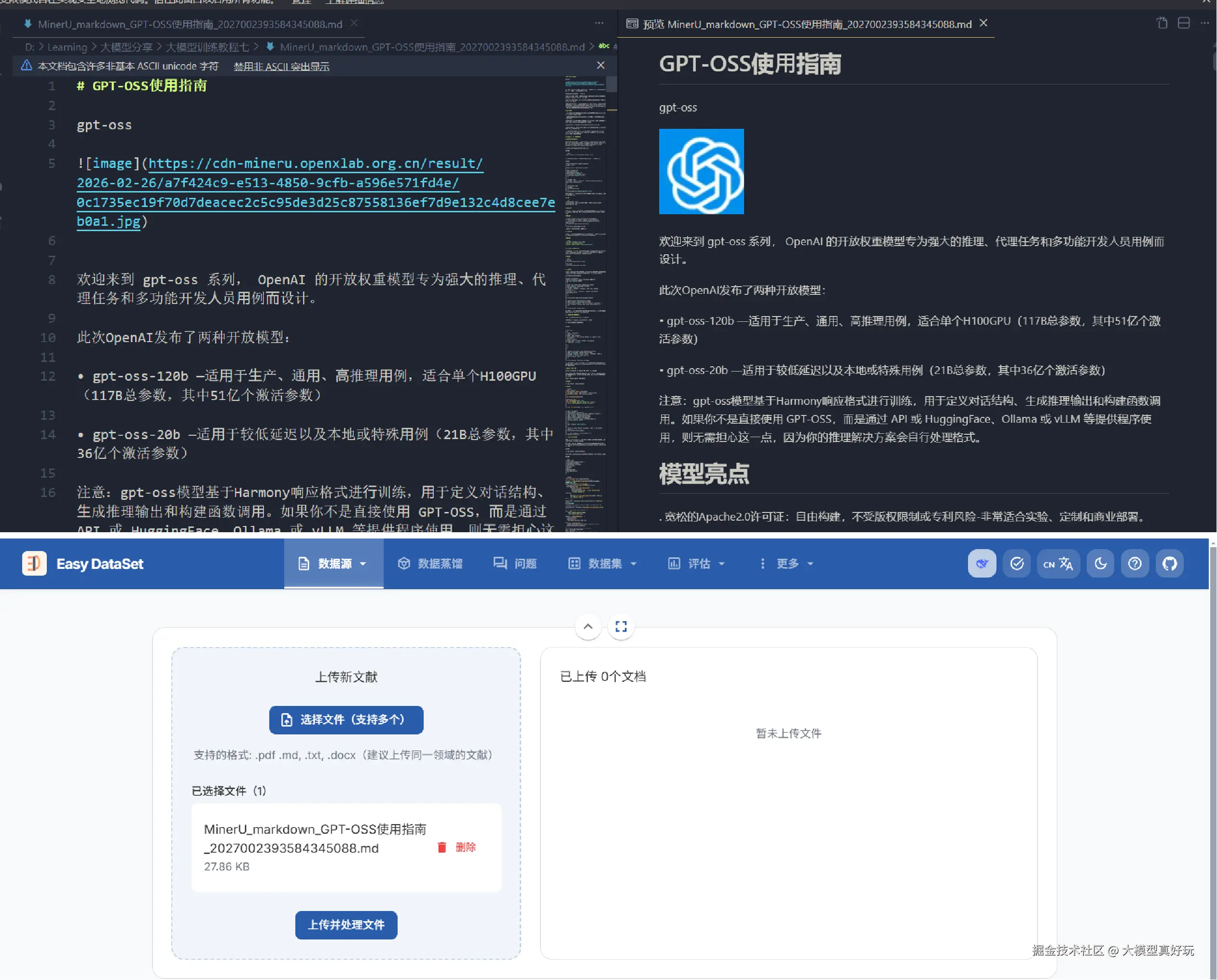 EasyDataset既支持单个文档处理,也支持文档批处理,为方便演示,本文使用一份通过 MinerU 处理好的文档《GPT-OSS使用指南》进行测试。大家可关注笔者同名公众号 「大模型真好玩」 ,并发送私信 「大模型训练」 免费获取该测试文档。