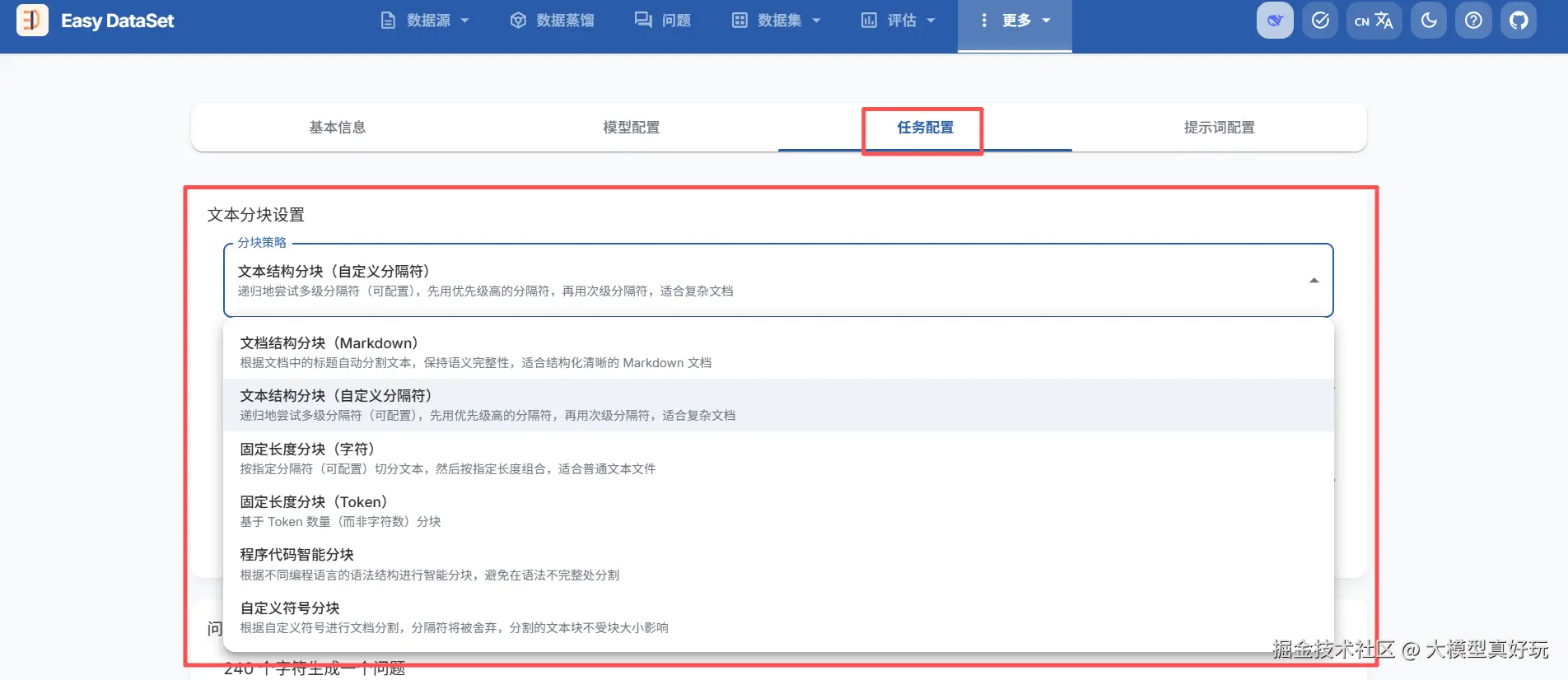 当处理包含大量代码的文档时,传统分割方式可能会切断代码逻辑,破坏语法结构。EasyDataset 提供了基于代码语义理解的分割方式,支持按目标编程语言进行智能分块: