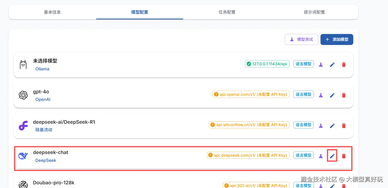 - 模型配置中心:兼容 OpenAI 格式 API 及本地模型(如 Ollama),内置 Playground 支持多模型对比,方便调试。