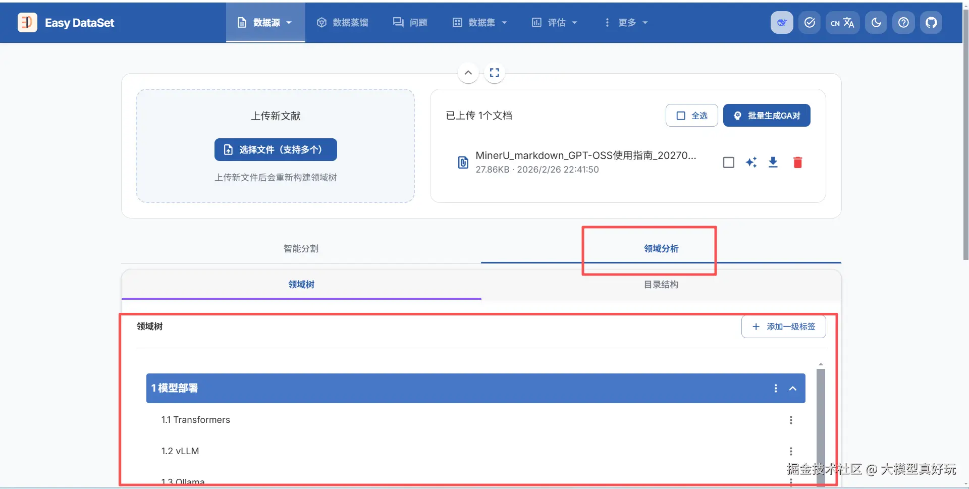 用户可以切换到"领域分析"选项卡,查看 EasyDataset 基于大模型智能生成的领域树以及从文献中提取的原始目录结构。后续生成问答对和数据集的任务中,平台将基于这个领域树进行映射,使每条数据都能关联到具体的领域标签。领域树不仅让每条数据具备全局理解能力,还能有效减少重复数据生成的可能性。