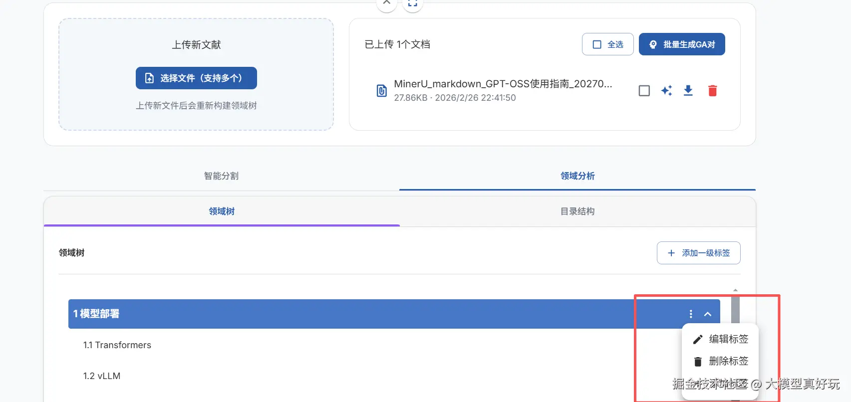 如果觉得大模型自动生成的领域树有不准确或不完善之处,也支持手动添加、修改或删除标签。要生成精确的问答数据集,领域标签的准确性至关重要。