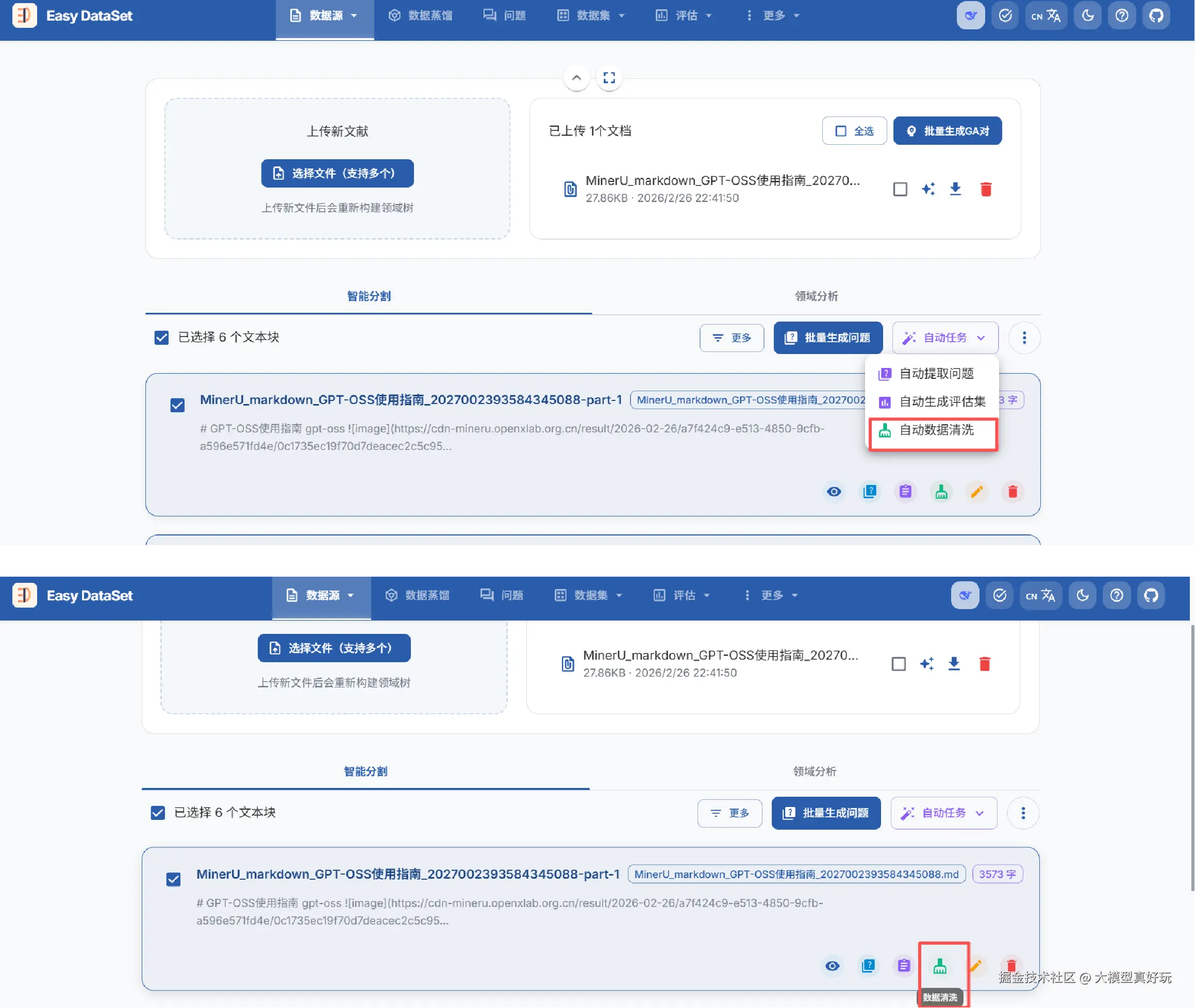 EasyDataset 内置了数据清洗功能,支持通过大模型对文本块进行更精细的净化处理。用户只需在界面上选择清洗任务,平台便会自动调用配置好的模型,识别并移除不合理的内容,从而提升数据集的整体质量。
