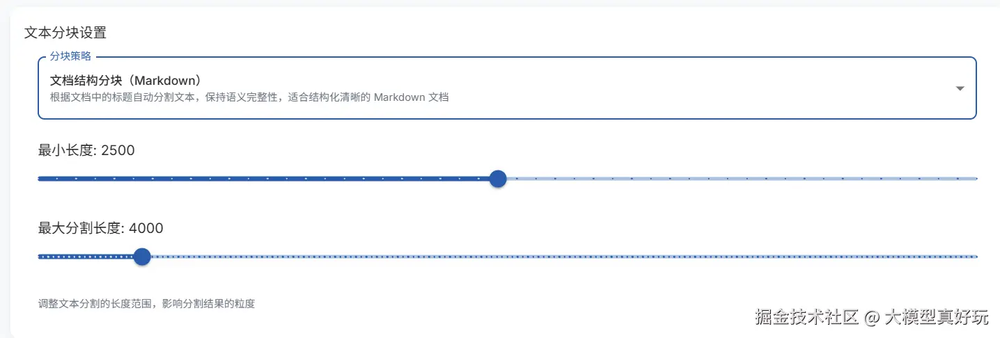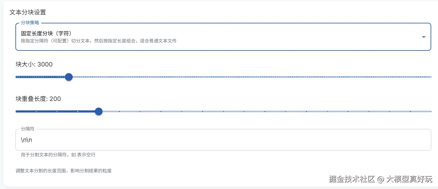 \n\n按段落分割。可根据文本格式调整为\n或---等。 - chunkSize:块的最大字符数。较小的值生成精细块适合精确上下文,较大的值能保留更完整语义。