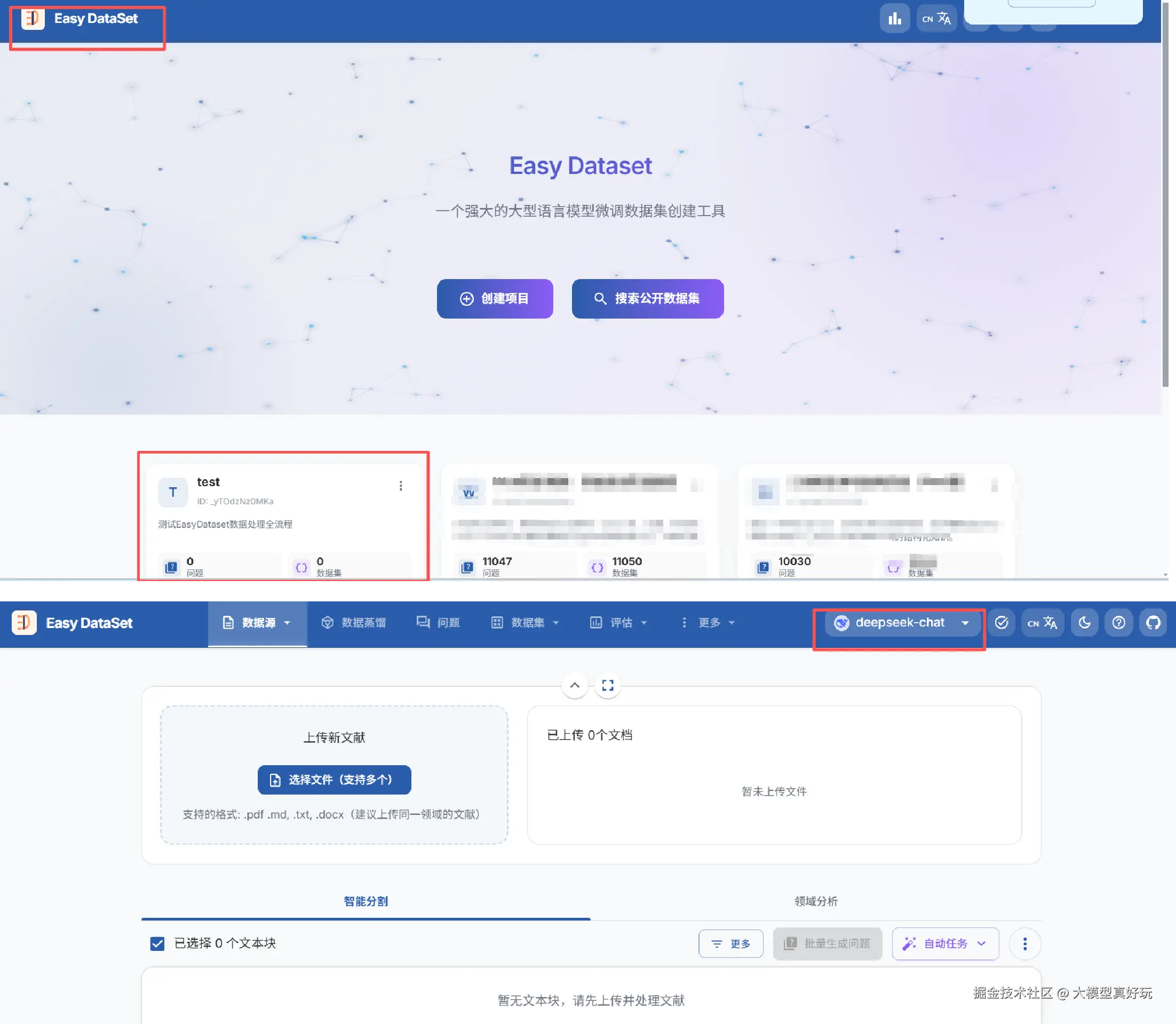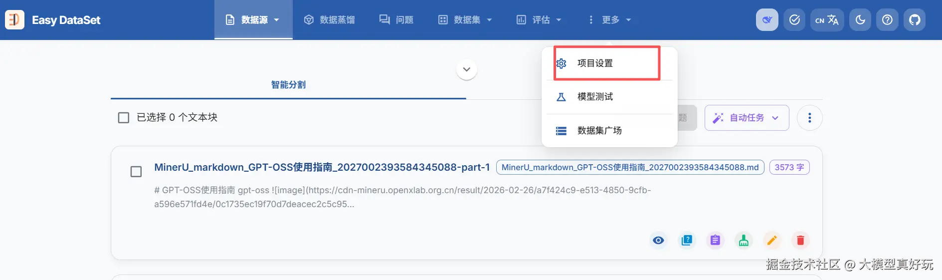 - 进入项目并开始处理: 除了模型配置,项目中还包含任务配置和提示词配置等选项。这里先保持默认设置,后续结合实际需求详细分享如何调整这些策略。完成配置后,点击左上角的 EasyDataset 图标返回首页,然后进入刚刚创建的