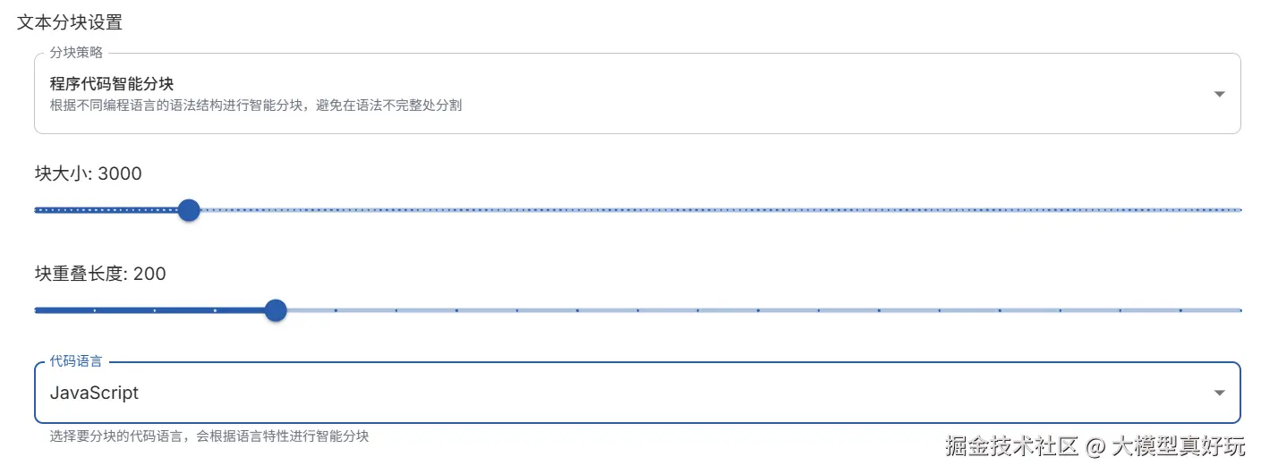 | 代码分块 | 编程文档、代码库、技术教程中的代码示例 | 保持代码语法完整;避免破坏函数、类等逻辑单元 | 需指定编程语言;对混合内容(文字+代码)需配合其他策略 |