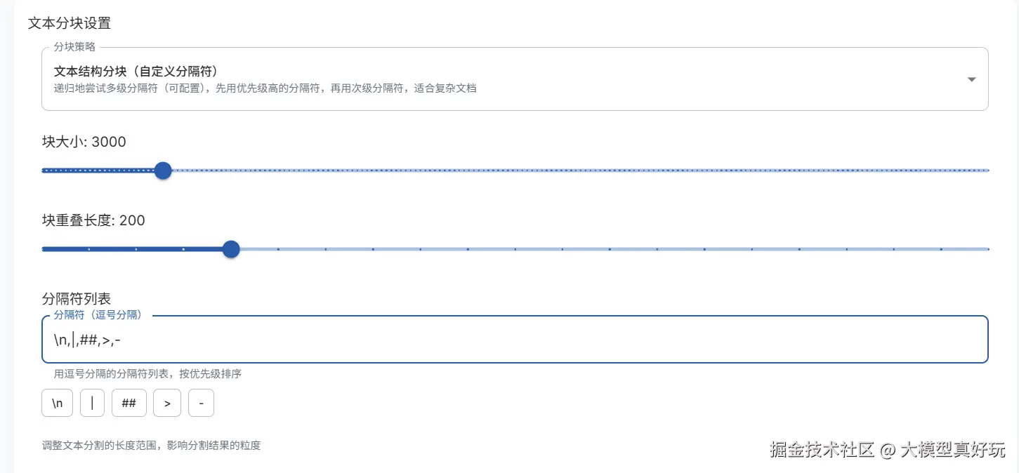 这种方式能较好地保持自然语言的流畅性和语义连贯性。配置时同样可设置最大分块大小和重叠字符数,同时支持自定义多个分隔符: