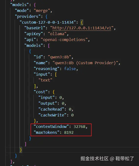 此时对话还存在问题。报错。需要修改默认生成的配置文件。改为如下的红框中的内容。因为openclaw最低要求的tokens数量为16000