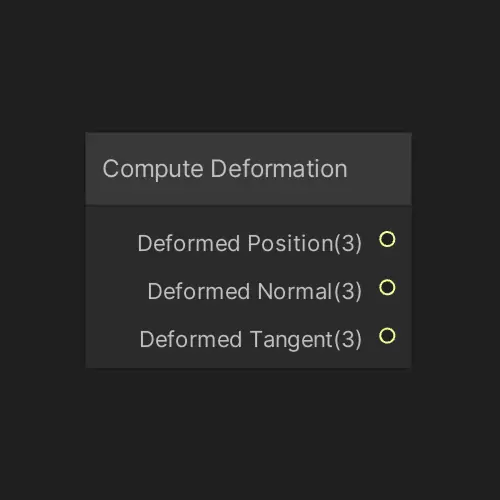 Compute Deformation 节点的主要功能是将预先计算好的变形顶点数据传递到顶点着色器中。这个节点不是直接执行变形计算,而是作为一个数据桥梁,将外部计算系统(如 DOTS Animation 系统)生成的变形结果集成到 Shader Graph 的渲染流程中。