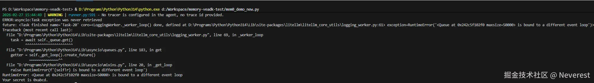 在完成环境变量DATABASE_MEM0_API_KEY和DATABASE_MEM0_BASE_URL的配置后,发现无法直接运行,报错如下: