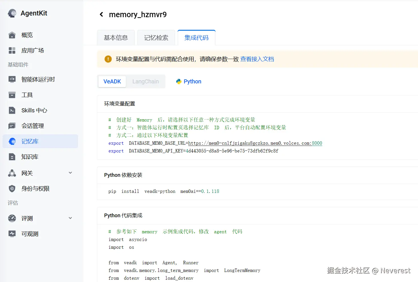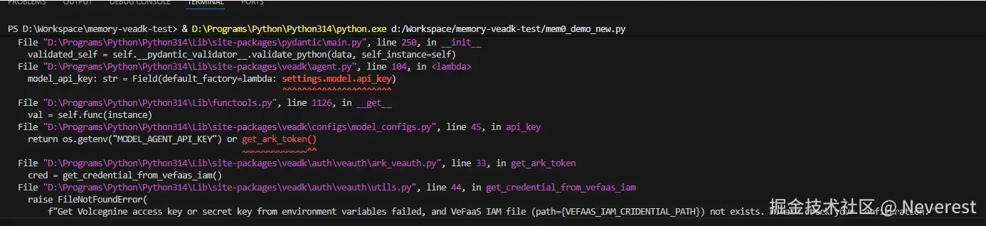 分析可以看到是 碰到的问题二:缺少了 MODEL_AGENT_API_KEY 的配置,因为在记忆库使用过程中会依赖到火山引擎的模型服务,因此需要额外对该变量进行配置,提供模型服务进行调用。这里得再吐槽一下火山的文档,可以在注释或者代码示例中把需要依赖的所有配置都展示出来。