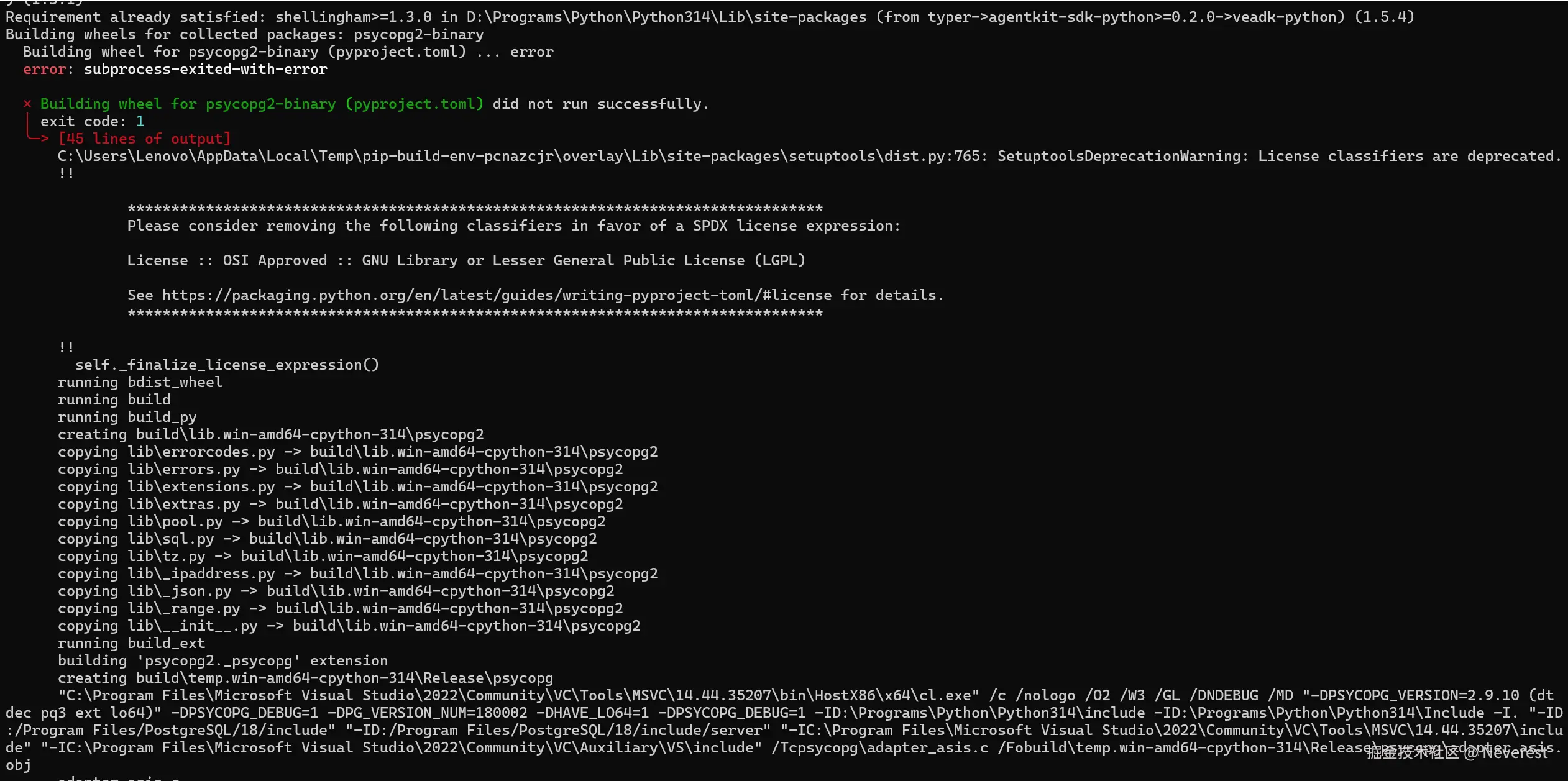 根据报错信息可以看到是编译安装psycopg2-binary报错,这里项目依赖并没有选择binary的方式进行安装,而是使用了直接编译依赖代码的方式,容易出现报错。