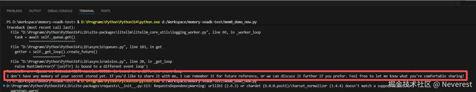 碰到的问题三:示例代码第一次调用,系统输出有问题,显示没有找到相关的记忆内容,输出内容如下: