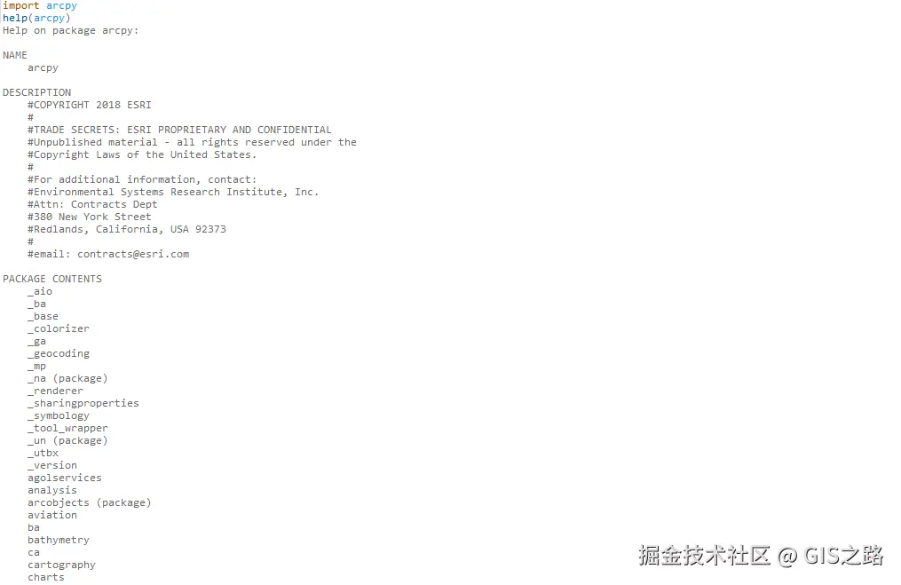 Python提供文档字符串功能。ArcPy中的函数和类在包文档中使用该方法。读取这些消息以及获取帮助的方法之一是运行Python提供的help命令。使用参数运行该命令会显示对象的调用签名和文档字符串。