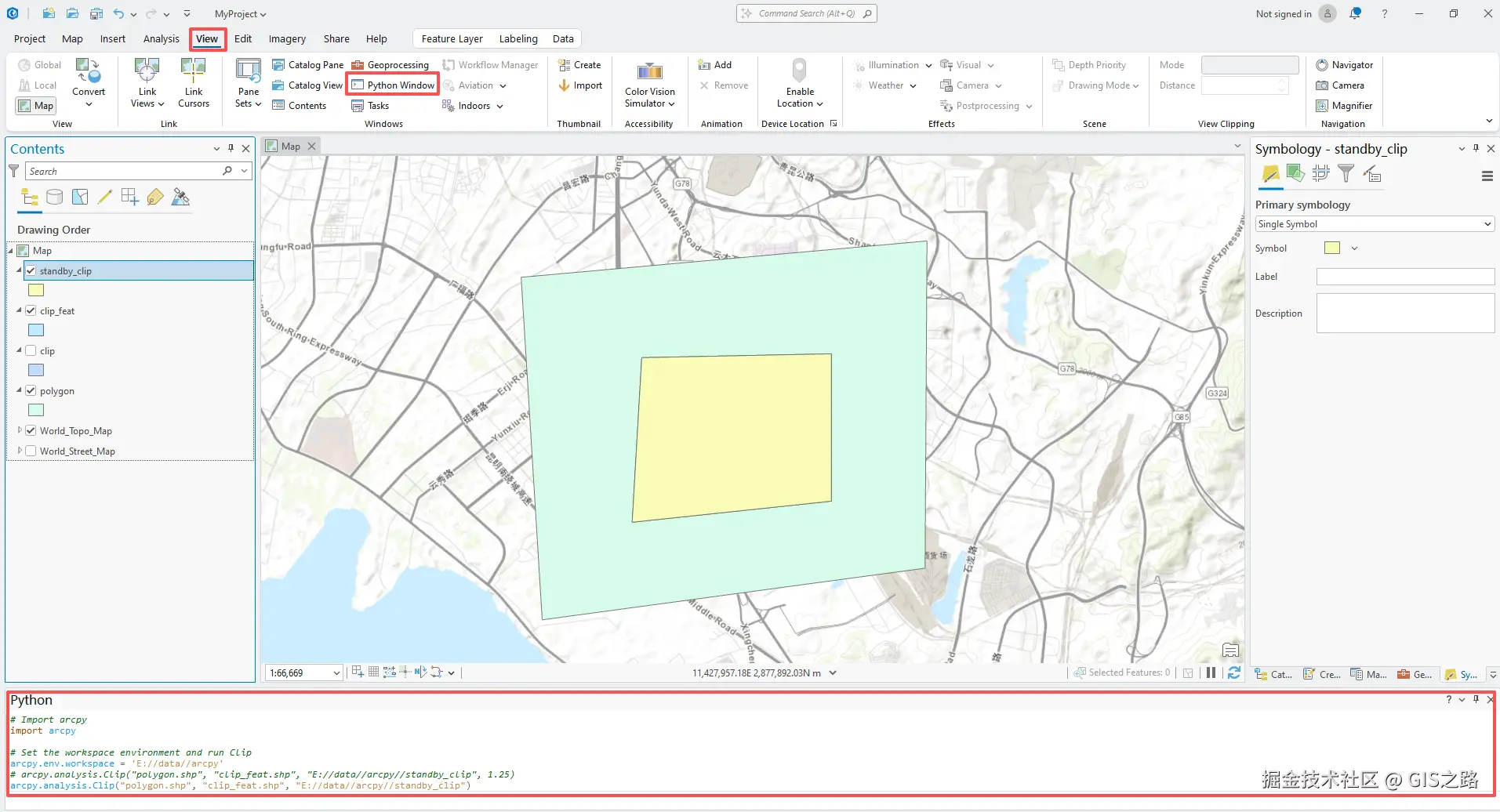 在Python窗口中写入以下代码。打开ArcGIS Pro软件,选择菜单栏视图View,点击Python window。借助Python窗口交互式控制台,可以通过Python解释程序直接在ArcGIS Pro中运行Python代码,而无需脚本文件。 可在该窗口中运行的Python代码包括单行代码,也包括复杂的多行代码块。