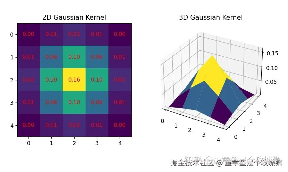左侧为将高斯滤波器中的参数值(权值)采用可视化的二维图像(2D Gaussian Kernel)来展示,每个方块中为滤波器参数。